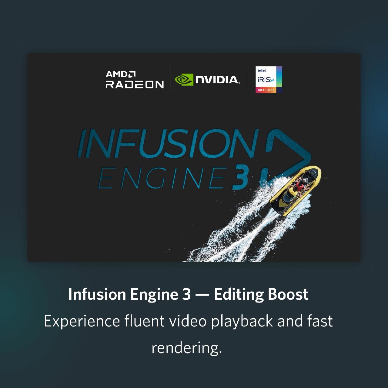 - Graphics card: INFUSION Engine 3 provides hardware acceleration for import and export through Intel, NVIDIA and AMD GPUs:Intel Graphics HD 620 or higher with 4 GB (Intel driver version 27.20.100.9466 or higher)NVIDIA Geforce GTX 1050ti or higher with 4 GB (GeForce Game Ready driver version 496.76)AMD Radeon RX470 or higher with 4 GB*hardware accelerated export AV1 from Intel Arc / NVIDIA 40xx